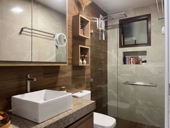 – Kitchen: custom cabinetry, marble countertop with stainless steel sink, wooden counter with table and chairs, induction stove, microwave, electric oven, stainless steel side-by-side refrigerator, blender, water purifier.