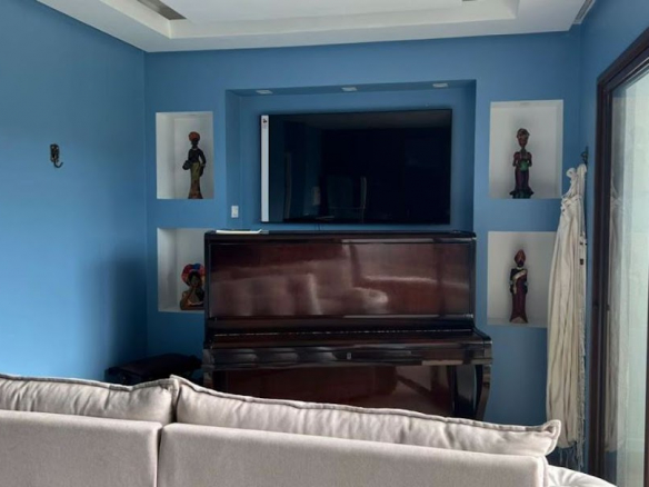 – Living room with custom cabinetry, 55″ TV, an excellent sofa;