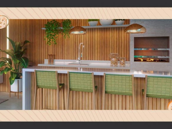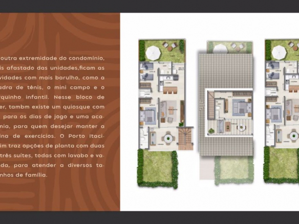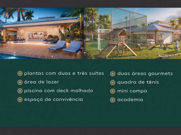 Porto Itacimirim is a development focused on comfort, aiming to become a refuge from the rush of everyday life. The units, oriented toward the interior of the property, are accessed via an intimate pathway with thoughtfully designed landscaping, further enhancing the feeling of being in a paradisiacal place. The condominium offers a generous leisure area, with ample space to serve all units and support a light, healthy routine. The pool, with a wet deck and a children’s section, features a dry deck along its entire length. Both face the lagoon, which can also be seen from the lounge. This social area is open and provides access to the pool, also connecting the two gourmet areas, fully equipped for gatherings with family and friends. At the other end of the condominium, farther from the units, are the noisier activities, such as the tennis court, the mini soccer field, and the children’s playground. In this leisure block, there is also a kiosk with a TV for game days and a gym for those who wish to maintain their exercise routine. Porto Itacimirim offers floor plan options with two or three suites, all with a powder room and balcony, to accommodate different family sizes.