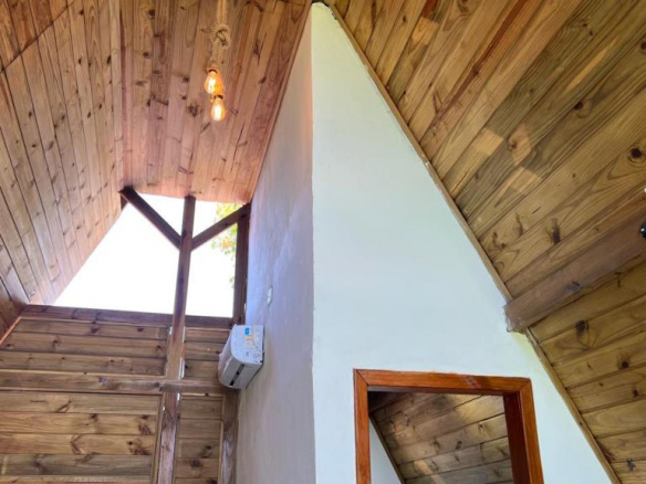 - Chalet with 50m² containing two floors: land floor in masonry containing a pantry/kitchen and the upper floor is all in wood (prefabricated) containing a large bedroom/living room (25m²), a bathroom and a balcony.