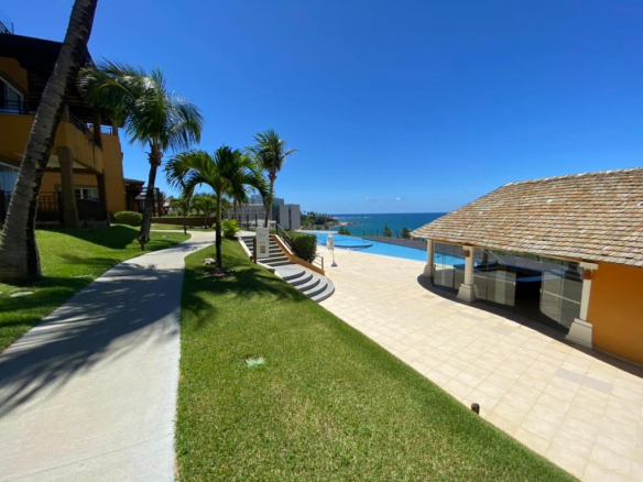 - The apartment has a view of the pool, living area, desk and 2 bathrooms;