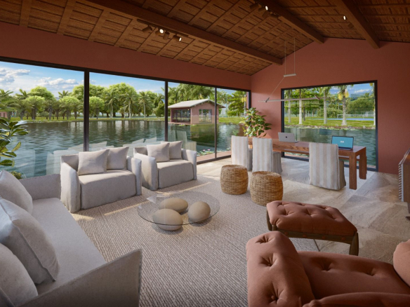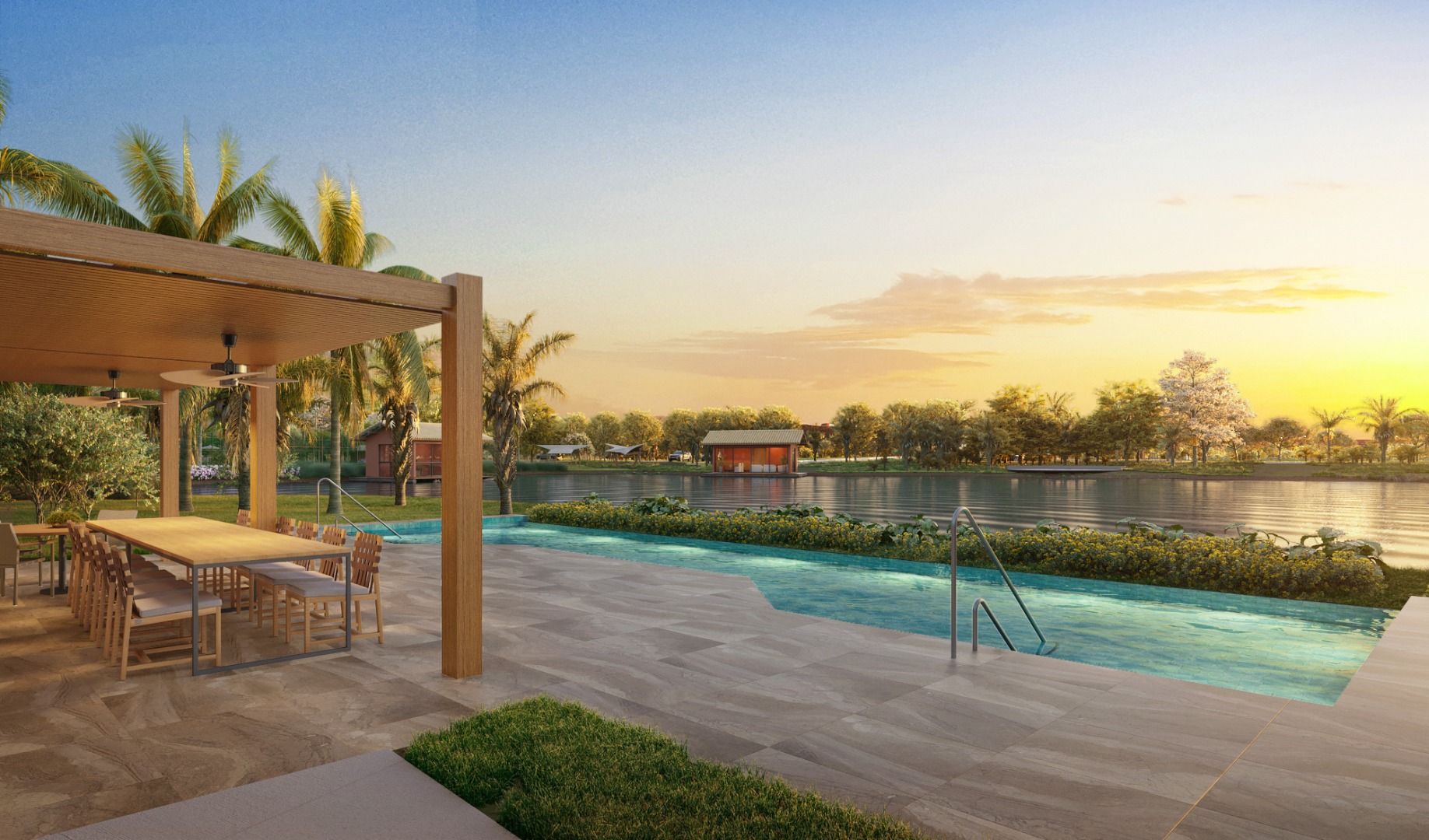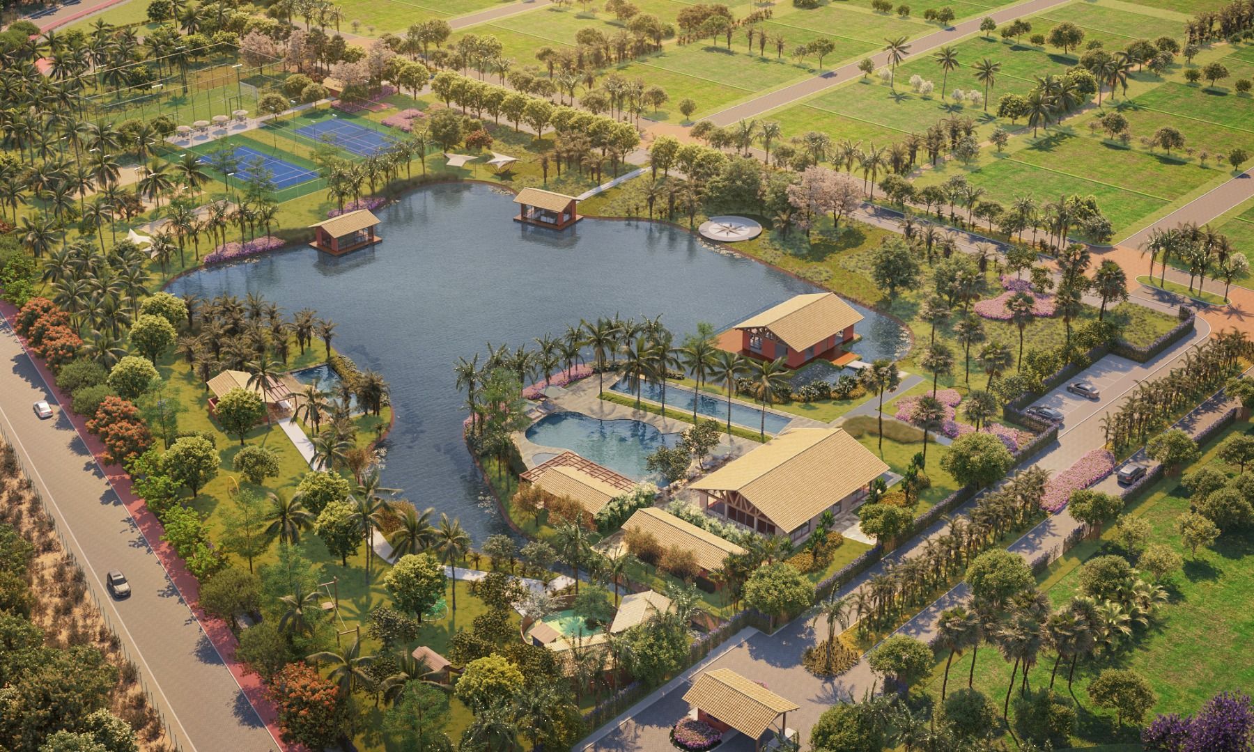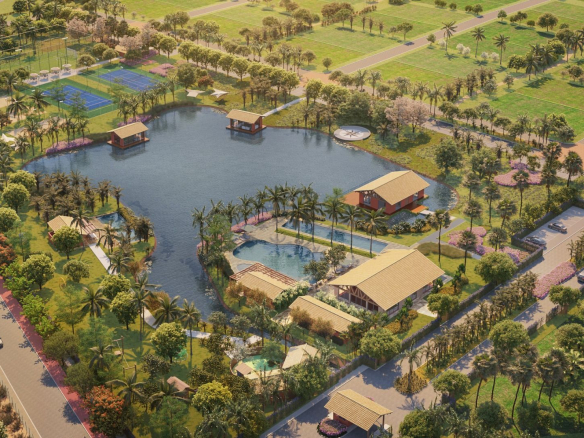 Gated community integrated with the lagoon, featuring lush landscaping and environmental preservation;