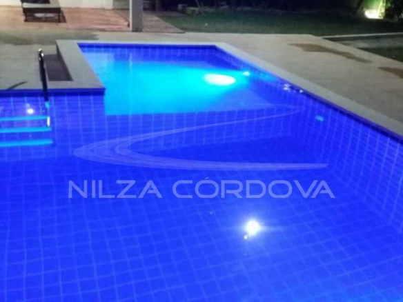 Swimming pool with sun loungers, tropical garden, gourmet space with barbecue and beer cooler, swimming pool;