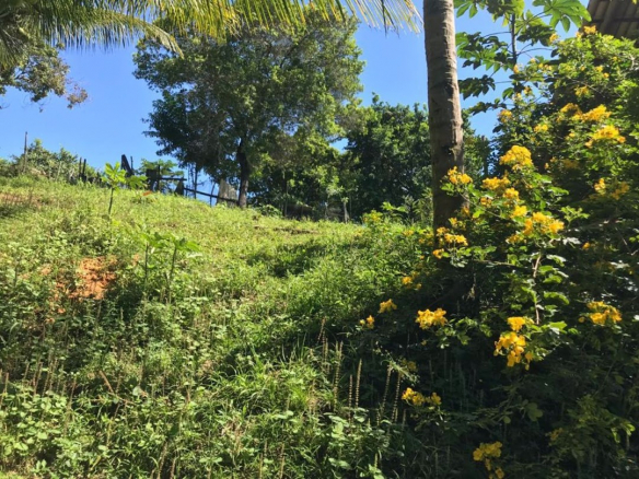 – The property is situated on a hilltop; the terrain is sloped, wooded, and features several fruit trees.