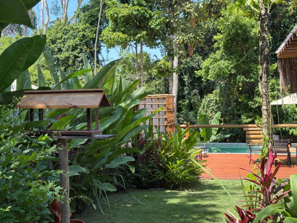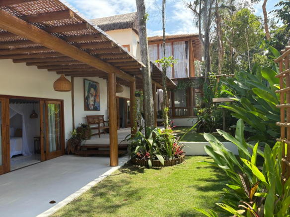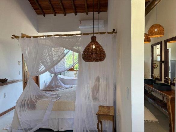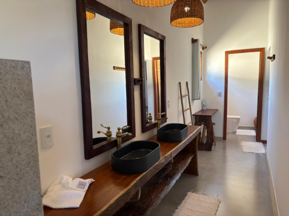 *5 Large Bathrooms:* All bathrooms offer comfort and privacy, one of which is a master bathroom, equipped with a bathtub. • *Integrated Concept:* Modern and fully equipped kitchen, with all necessary appliances, integrated with the dining room and living room, creating an ideal environment for socializing and family moments. • *Full Service Area:* Functional and practical space to meet guests’ needs during their stay.• *Leisure and Comfort:* Large garden for relaxation, two outdoor showers, equipped barbecue area, swimming pool with spacious deck and toilet for greater convenience. • *Generous Garage:* Space for up to five cars. • *Technology and Comfort:* Bathrooms equipped with air conditioning, high-speed Wi-Fi, as well as a lighting system designed for greater sophistication and well-being. • *Elegant Decoration:* With premium finishes and details that provide a cozy and functional environment.*Privileged Location:* Located in a gated community with 24-hour security, quiet and safe, the house is close to supermarkets, pharmacies and other essential services, in addition to offering easy access to the main attractions in the region.