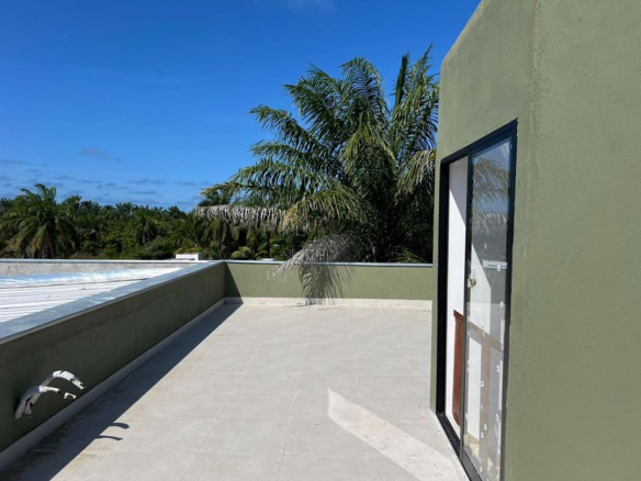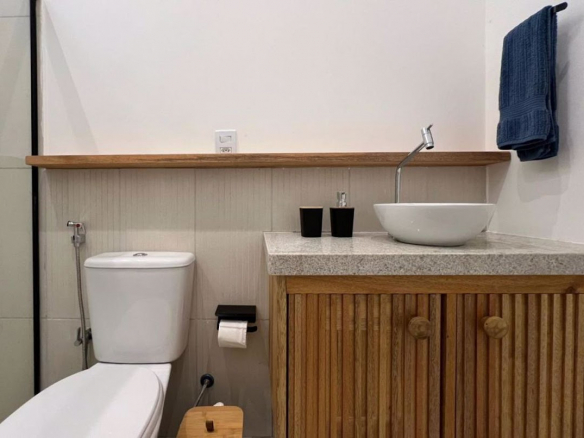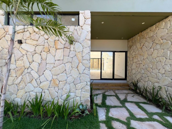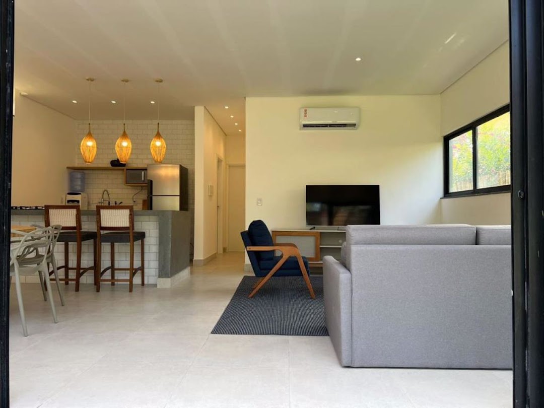 The houses and apartments feature a spacious living area with an open-plan kitchen and burnt cement countertops, a guest bathroom with a shower, and aluminum window frames;