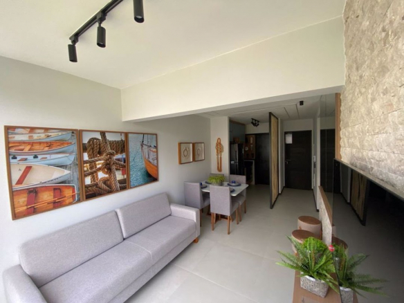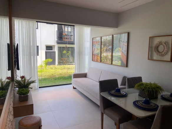 Apartment 24 located in a high-end gated community, close to the main attractions of Praia do Forte yet away from the crowds, surrounded by nature. • Furnished 2-bedroom apartment (air-conditioned); • Fully equipped kitchen; • Living room; • Condominium amenities: Multi-sport courts, infinity pool, gym, bar, sauna. Accommodates up to 6 people; • 2 parking spaces; • 24-hour security; • Reflecting pool; • Complete infrastructure, including a guardhouse, storage room, bathroom, paved roads, grass walkways, and street lighting;
