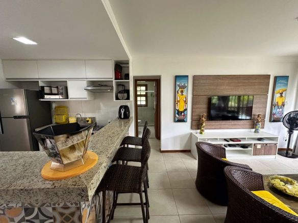 Apartment in a high-standard condominium with complete infrastructure, providing comfort, security, and tranquility. • Furnished apartment with 76.38 m²; • 2 bedrooms (double bed and wardrobes); • Integrated living and dining room; • Balcony with view to green area; • Parking; • 24-hour security; • Pedestrian exit to Timeantube Lagoon leading to the Village, swimming pool, gourmet area, children’s playground, sports court, tennis court, and extensive green areas surrounding the buildings.