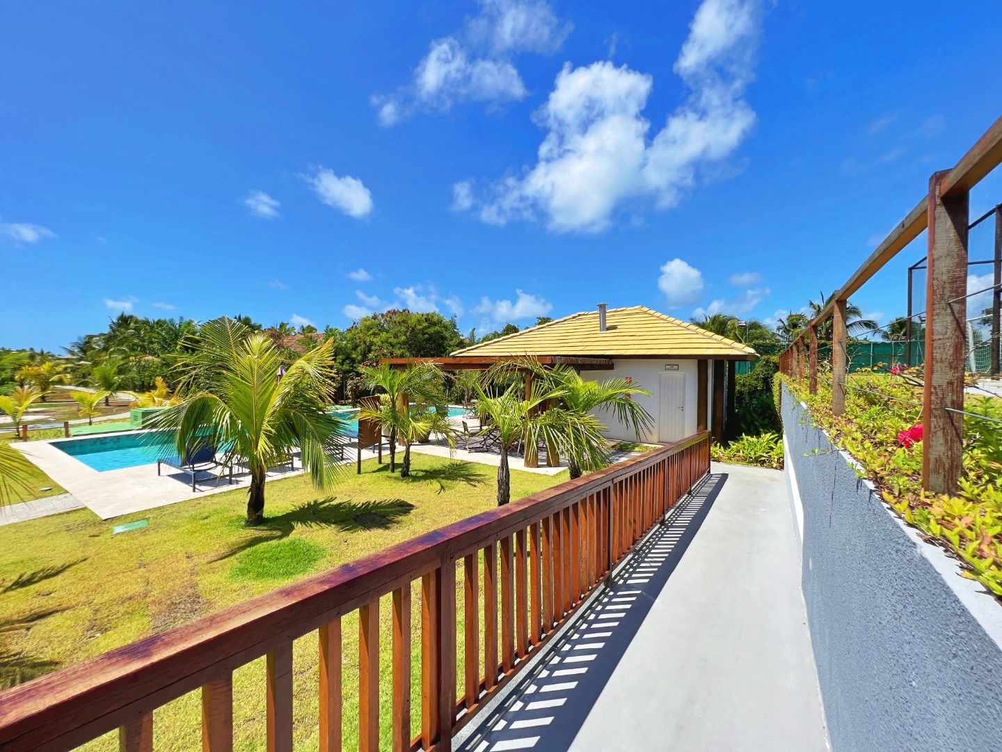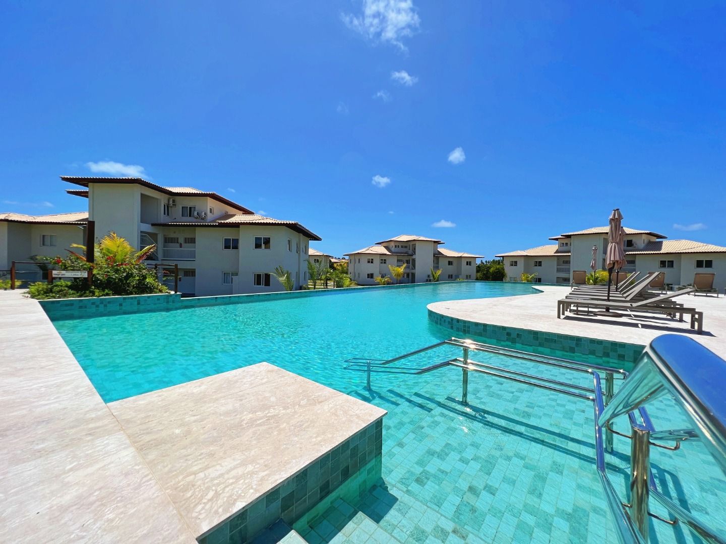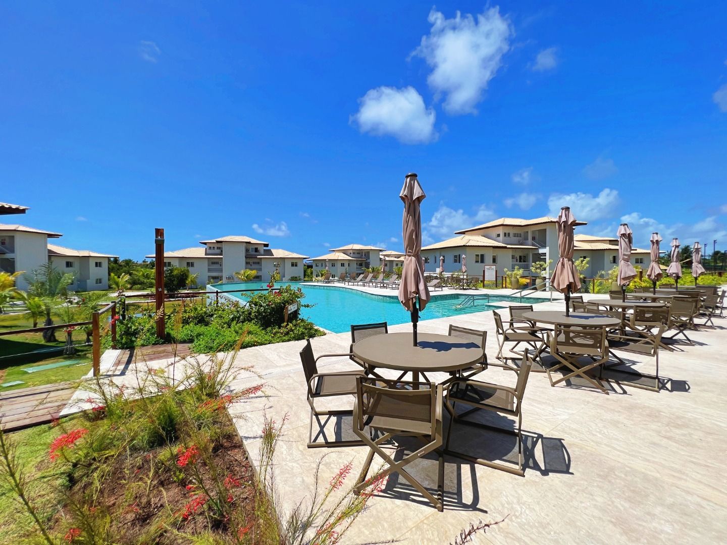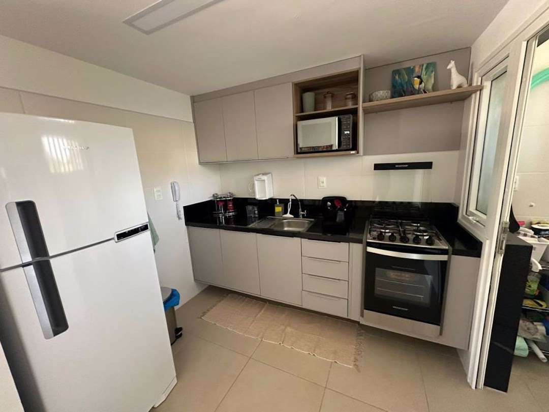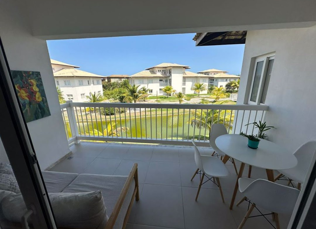 Modern and well-lit apartment, located on a corner with full morning sun exposure (east-facing). • Apartment with 92.00m²; • 02 Suites, convertible to 3 bedrooms; • Full morning sun (East-facing); • Furnished; • Living Room; • Balcony; • Kitchen; • Laundry Area; • 02 Covered Parking Spaces; • Condominium features: swimming pool, gym, tennis court, beach tennis court, small soccer field, sauna, lakes, golf cart service, exclusive beach access; • 24-hour security; • Shuttle service to the Village;
