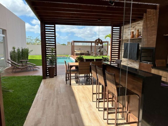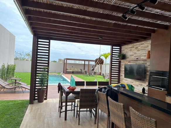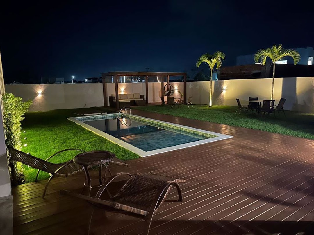 Located in the finest gated community in Barra do Jacuípe. • House with 270 m²; • 4 air-conditioned suites, each with two exits: one leading to the garden (glass door) and the other to the social hallway; • Guest bathroom, 1 bathroom in the gourmet area, 1 staff suite; • 1 air-conditioned home theater; • Built-in cabinetry in every room, all furniture from Lar Shopping; • Garage; • Veranda with service area; • Swimming pool with wooden deck, illuminated garden, gourmet area, barbecue grill, beer cooler, sun loungers in the gourmet area with 2 sets of chairs and 4 tables each, Zen area with pergola featuring a hanging swing and full sofa.