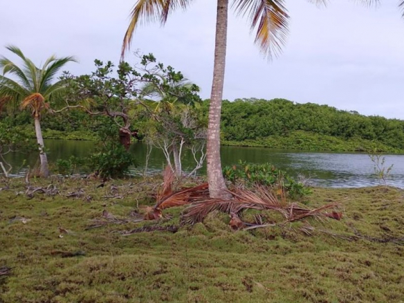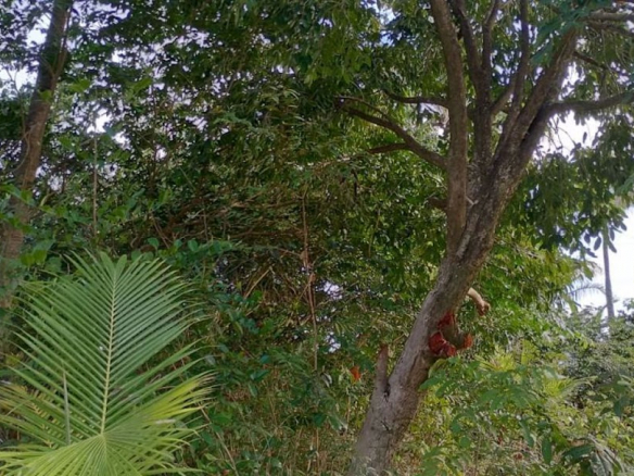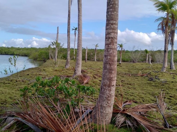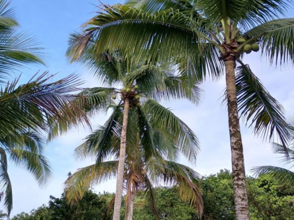 The grounds include coconut palms, oil palms, mango trees, cashew trees, and native plants;