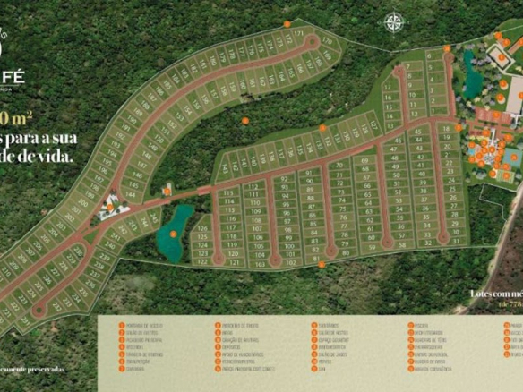The first Farm condominium on Bahia’s North Coast, 5 minutes from Praia do Forte and close to the other main destinations along the North Coast. A new concept to enjoy with the family—good for quality of life and good for investment. A large area of over 500,000 m². Only 245 lots ranging from 800 m² to 1,400 m². Project by Sidney Quintela. Two fully equipped clubs: one themed like a countryside village and the other a leisure club with a swimming pool, 2 tennis courts, gym, spa, soccer field, event hall, game room, and gourmet area. An equestrian practice center, including for professional events. Horse stalls. A 4 km riding trail around the entire condominium. Located on one of the most beautiful farms near Praia do Forte, surrounded by hills and stunning nature. Visitor parking spaces are distributed throughout all the condominium streets. Individual sewage network, drainage, and water infrastructure within the condominium. Flexible payment options with 12-, 24-, 36-, 48-, and 60-month plans. Discounts for cash payments.